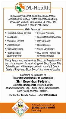 R S S Jankalyan Samiti Kurla is all set to launch first of its kind Mobile application “ M-Health” at the hands of Honorable Chief Minister of Maharashtra Shri Devendra Fadanavis Ji, on Sunday the 21st February 2016 evening 6 pm at New Mill Ground, Kurla West. Smt Poonam Mahajan (Member of Parliament), Shri. Mangesh Kudalkar (MLA Kurla), Shri Sanjay Potnis (MLA Kalina), Shri Sunil Sapre RSS Kokan Prant Secretary, Shri Ravi Karve, Chief of RSS Jankalyan Samiti Kokan Prant, Shri Sharadbhau Khadilkar, Organising Secretary RSS Jankalyan Samiti Kokan Prant, will also grace the occasion.